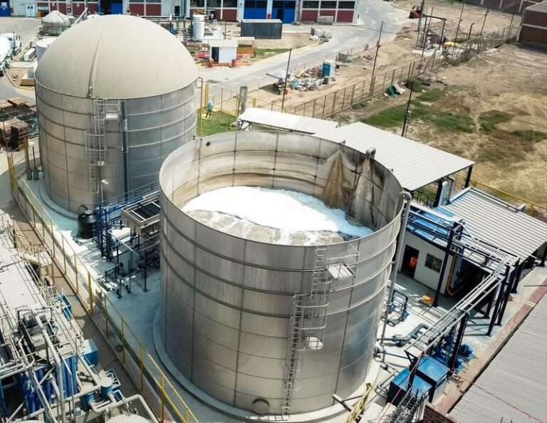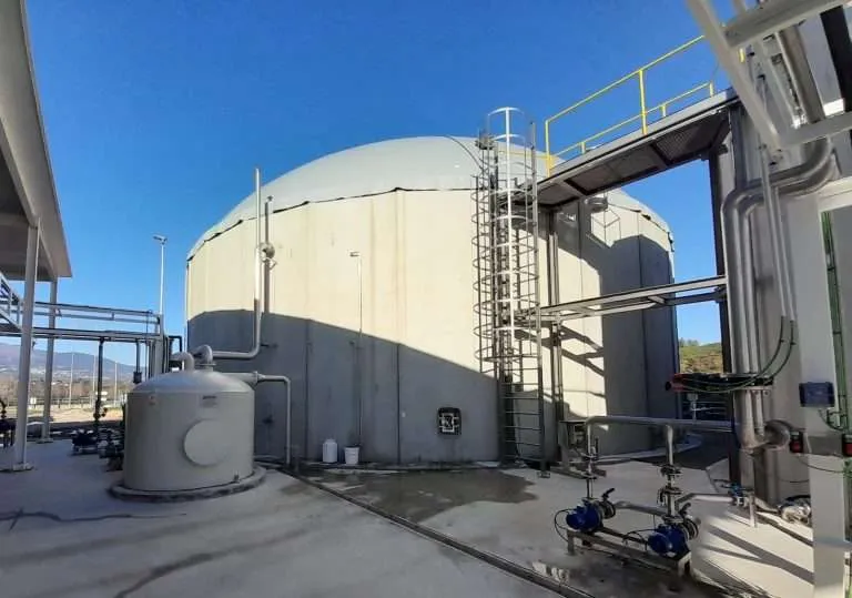 Réacteur anaérobie à flux ascendant de contact SIGMA-RANC : Ce réacteur biologique fonctionne en absence d’oxygène à de faibles charges volumiques, obtenant ainsi des rendements élevés de réduction de la DCO et de la DBO₅ grâce à un processus simple, sans mécanismes ni clarificateurs internes, et intégrant une couverture en géomembrane agissant également comme gazomètre. La matière organique dégradée est transformée en eau traitée et en biogaz.