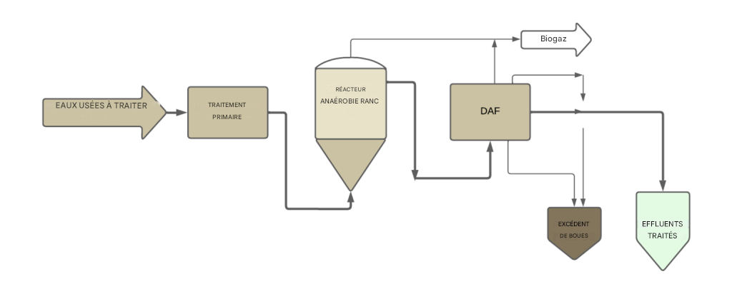 La séparation des boues anaérobies du réacteur est réalisée dans un clarificateur externe SIGMADAF, équipé d’une couverture étanche pour récupérer le biogaz libéré.
